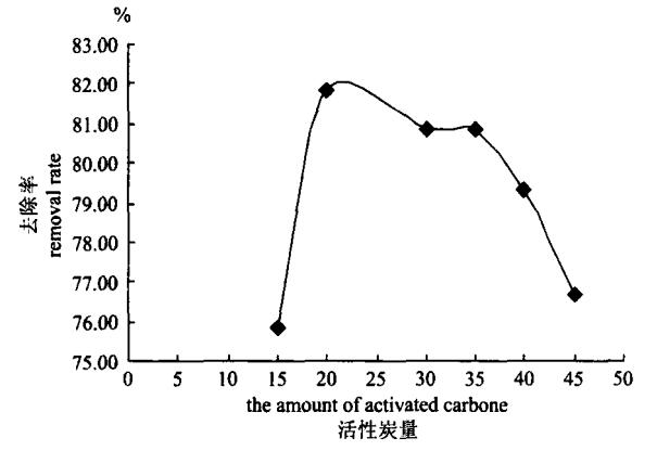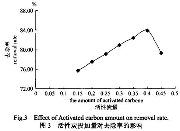 改變活性炭的投加量,其結(jié)果見圖3,由圖可見隨著活性炭量的增多,苯酚去除率升高,并在活性炭量為0.4g時達到較大值,然后隨著活性炭量的繼續(xù)增多而降低。